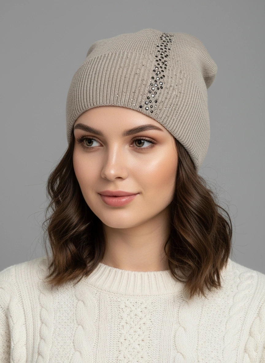 Beżowa czapka damska z kryształkami – elegancka czapka zimowa z ozdobą