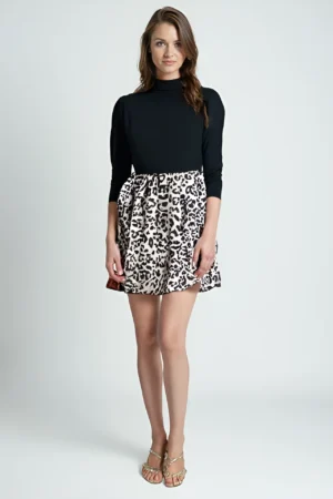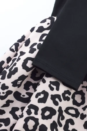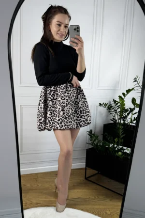 - Unikalny design: połączenie prostej, czarnej góry z efektowną, wzorzystą spódnicą w panterkę tworzy niepowtarzalny look.
