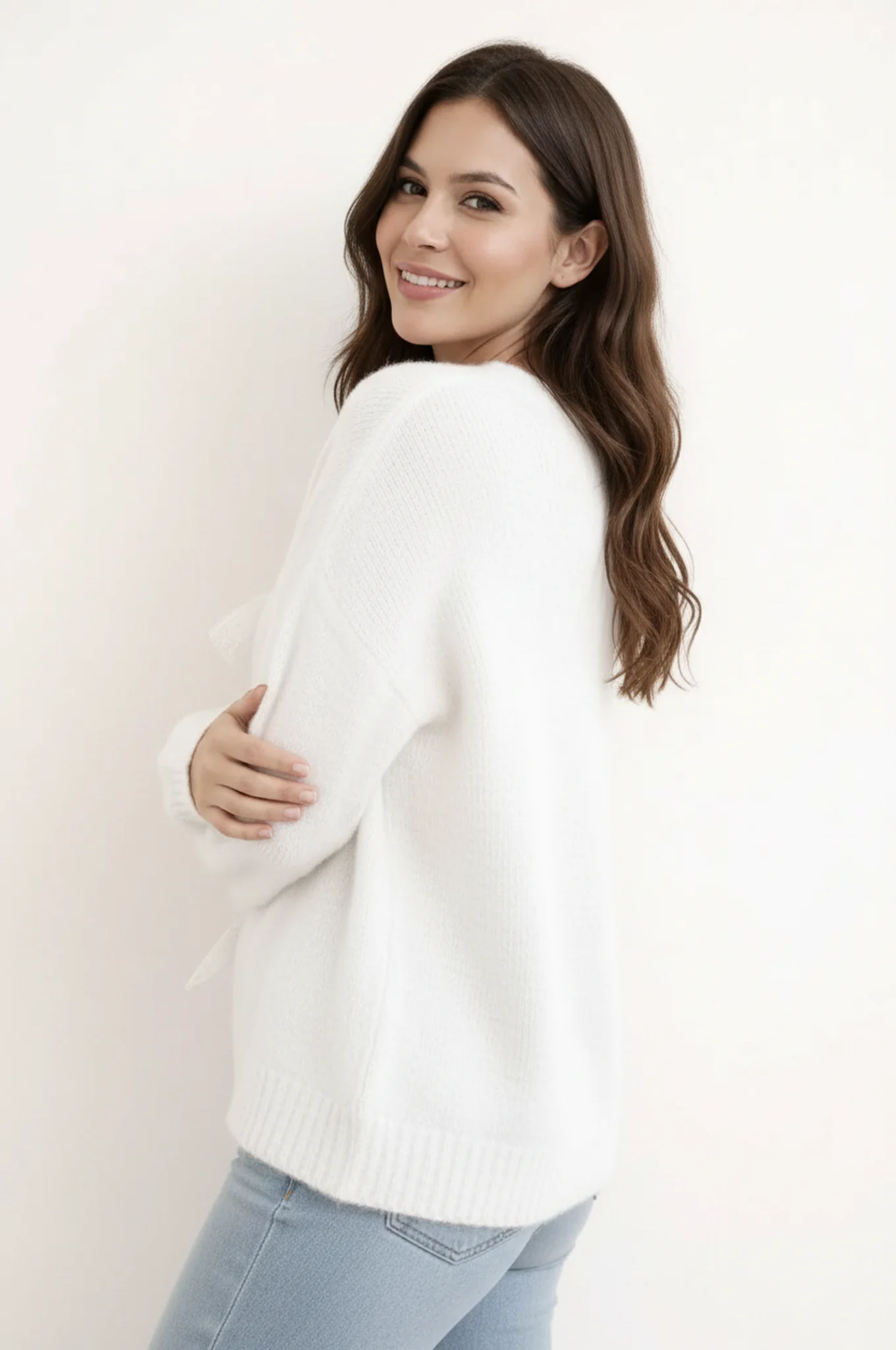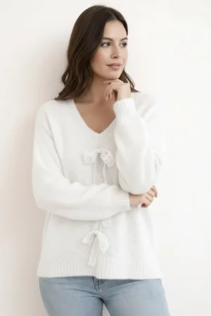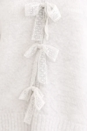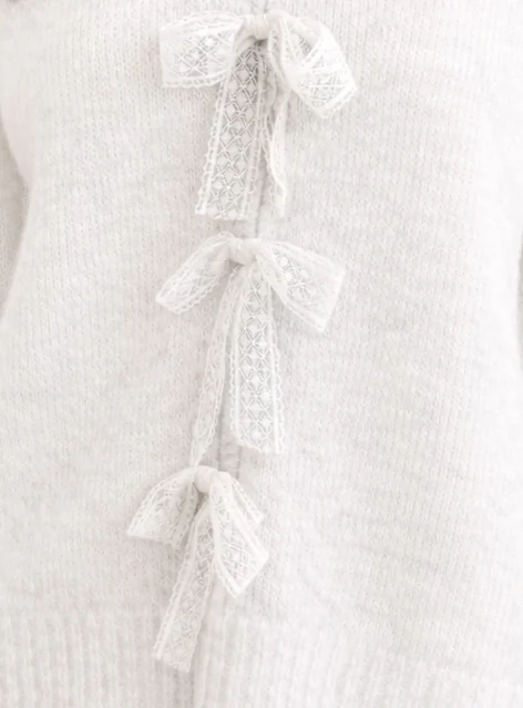 Sweter posiada koronkowe kokardy jako eleganckie detale oraz ozdobne wiązania z przodu, które dodają mu wyjątkowego charakteru.