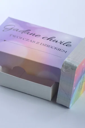 „Gadane Chwile” to zestaw 90 pytań (45 dwustronnych kart), które pomagają dzieciom otwierać się, mówić o emocjach i budować zaufanie. Idealne dla dzieci w wieku 3–10 lat – do użycia w domu, przy kolacji, przed snem lub w podróży.