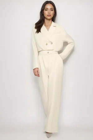 Elegancki, beżowy garnitur Chloe. Krótki żakiet i szerokie spodnie. Idealny na każdą okazję! Wysoka jakość, Made in Italy.