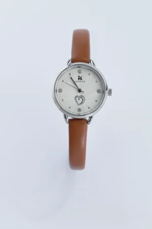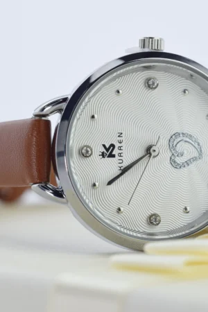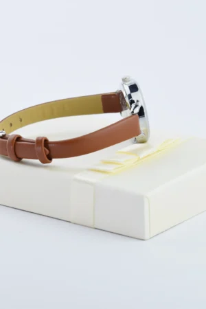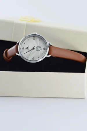 Nowoczesny zegarek damski z brązowym paskiem i srebrną kopertą