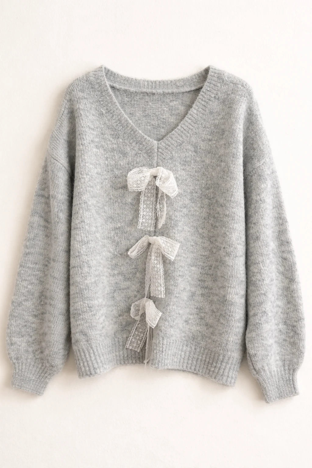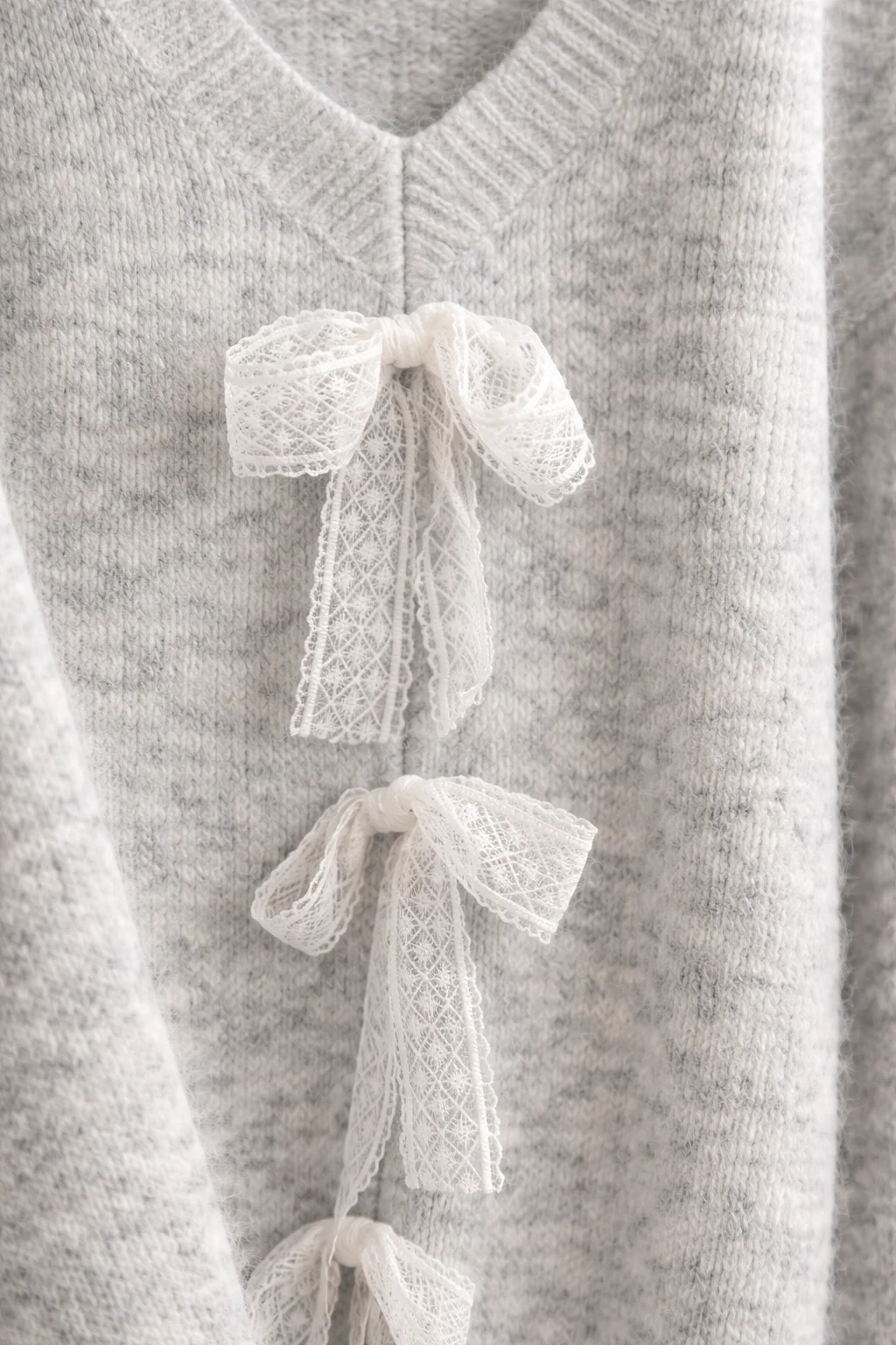 Tak, szary damski sweter został ozdobiony koronkowymi kokardkami na przodzie, co dodaje mu wyjątkowego charakteru i sprawia, że jest świetnym wyborem na różne okazje.