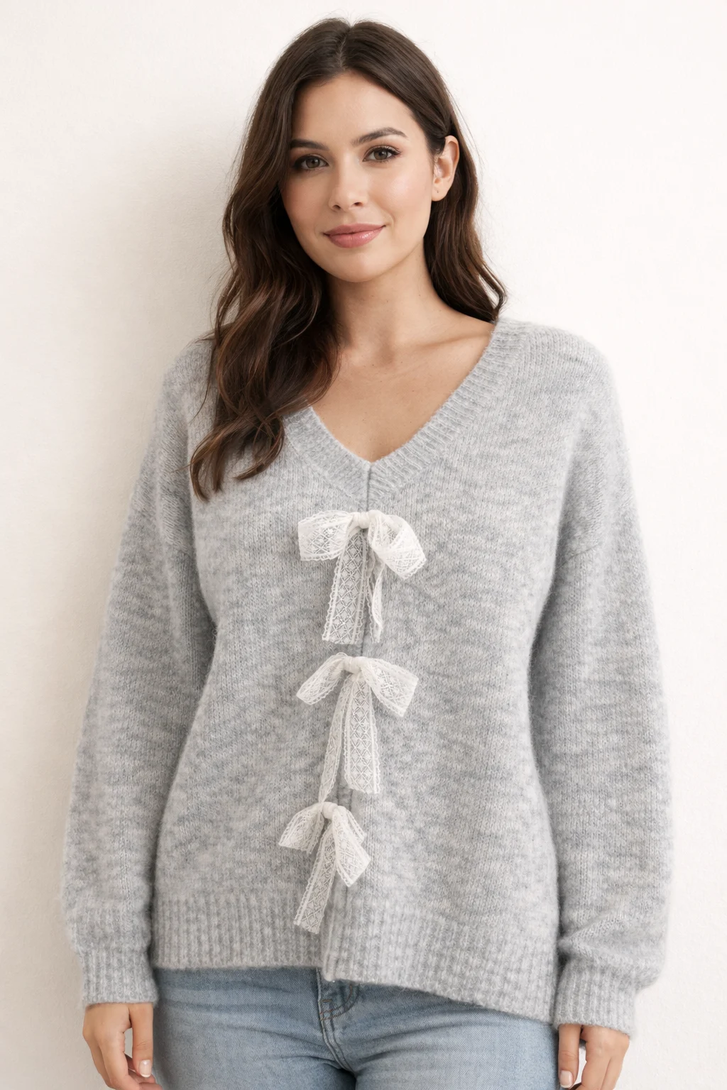 Szary damski sweter z ozdobnymi kokardkami